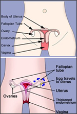 Near the middle of your cycle you release an egg from one of your ovaries. Hormones from your ovaries will have already thickened your endometrium, ready to receive the egg. If your egg is fertilised by a sperm, it will stick firmly to your endometrium and develop into a baby in your uterus. If it is not fertilised, your hormones change. This change makes your endometrium come away with some bleeding; this is a period. After a few days a new thin layer of endometrium forms. This starts to thicken, ready to receive a fertilised egg during your next cycle. After the menopause, your ovaries stop producing the hormones that control your menstrual cycle. Your endometrium remains thin and your periods stop.
